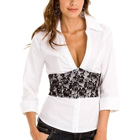 You'll have to resist the urge to saunter when you wear this alluring top. Fitted waist with lace accent creates a corset appearance. Plunging v-neck with slightly wide collar. Lace has a rose pattern. Long sleeve. Camoflauged zipper at front. Women > Tops > Shirts