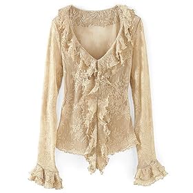 * Sheer ruffled blouse in stretch lace. Nylon/ spandex. Hand wash. Imported.