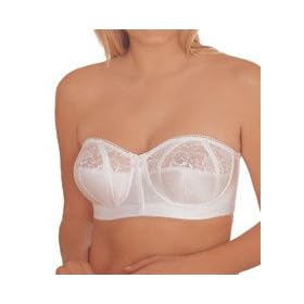 The Goddess strapless bra features flexible boning for support and lift. The cups are topped with fine gauge lace and the back is made of stretch mesh for extra comfort.