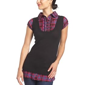 Short sleeve 2-fer. Get the layered look all in one piece with plaid blouse and black cotton vest.