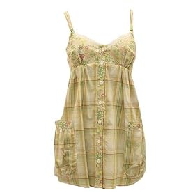 Green & Yellow Printed Woven Tunic Top. Two pockets and button down. Back tide waist. Spaghetti strap.