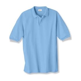 Features: 5.5 oz., 50% cotton/50% polyester. Welt-knit collar, rib-knit cuffs; 2-button placket, pearl buttons; double-needle bottom hem.